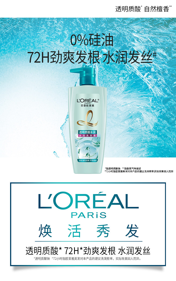 名称:欧莱雅茶树植萃去头屑控油透明质酸无硅油浅香洗发水修护防毛躁
